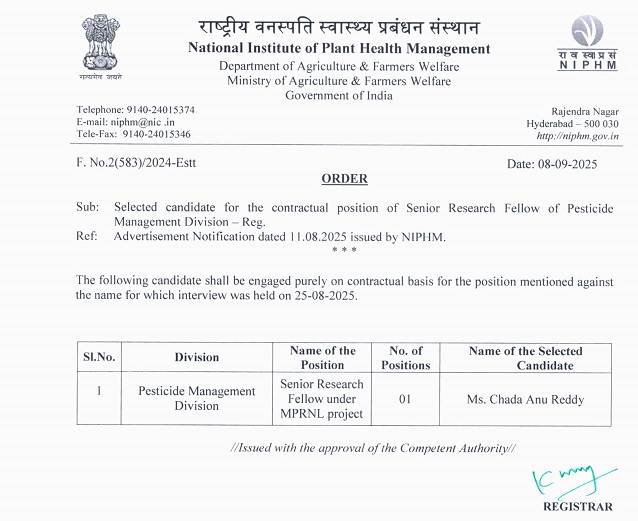 8.Selected candidate for the contractual position of Senior Research Fellow - Pesticide Management Division under MPRNL Project for which interview was held on 01-07-2025 ![]() For details download : ![]() |